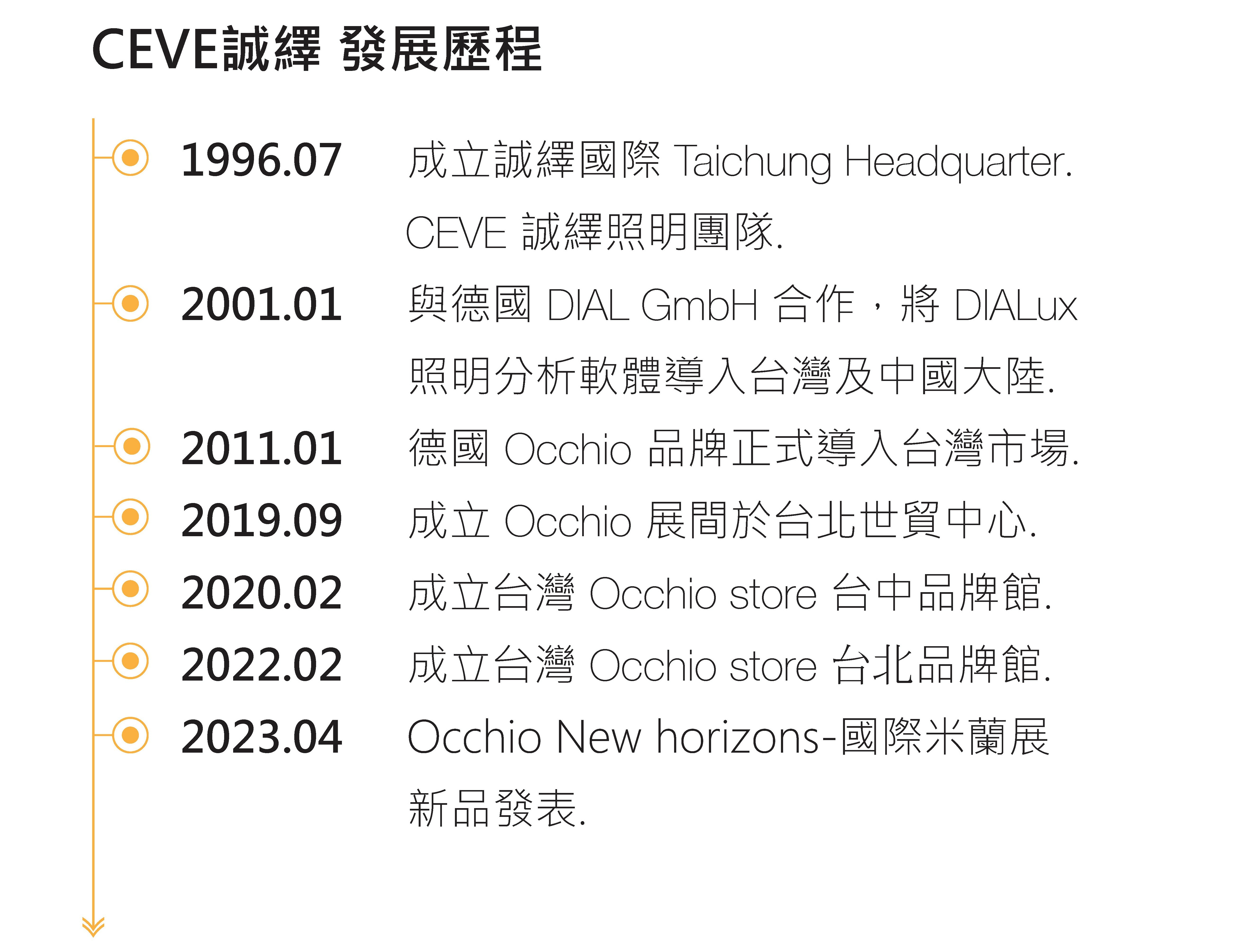 2010年 CEVE誠繹國際創辦人林宏泉(Kevin Lin)至歐洲進行商務拓展,於展會中遇見德國指標燈飾品牌Occhio創辦人雅各賽爾.麥斯(Axel Meise),兩人相談彼此於專業領域中的商業經營理念一拍即合,隨即誠繹國際加入全球策略聯盟。德國Occhio蘊有三大品牌理念,「燈光品質、設計品質以及愉快的使用體驗」(Lighting Quality、Design Quality、Joy of Use),從始至終嚴格把關光學元件,讓燈具內建LED晶片具有演色性指數97的擬真自然光,外型簡練俐落成為市場中備受矚目的焦點,產品系統模組化能夠因應壁燈、吸頂燈、吊燈及桌立燈等多種機能,因此也受到台灣設計師與中高端消費者的喜愛,展現CEVE誠繹國際的慧眼獨具。