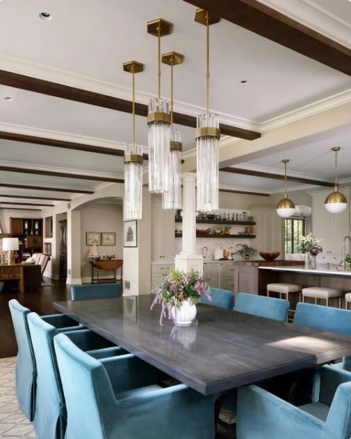 Suspended above the table, a composition of Luna pendants casts ripples of warm light.