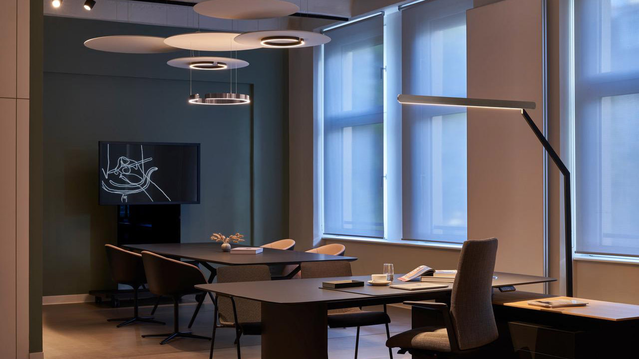 德國建築開發商Binnberg的一間位於慕尼黑Gabrielenlofts的新辦公室,是由一個工廠建築的功能室改造成而成的創造性工作的空間。 Occhio的燈具通過這間新辦公室的照明佈局..
